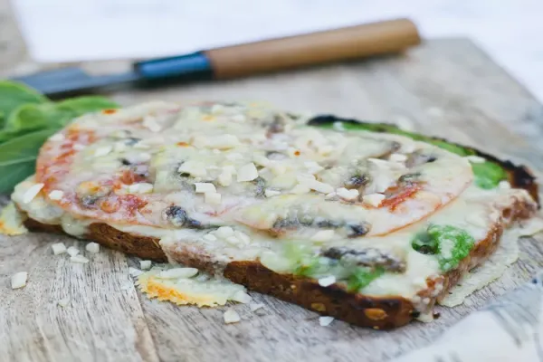 A satisfying open-faced veggie melt with avocado, almonds, and mushrooms. This sandwich is ready in minutes!