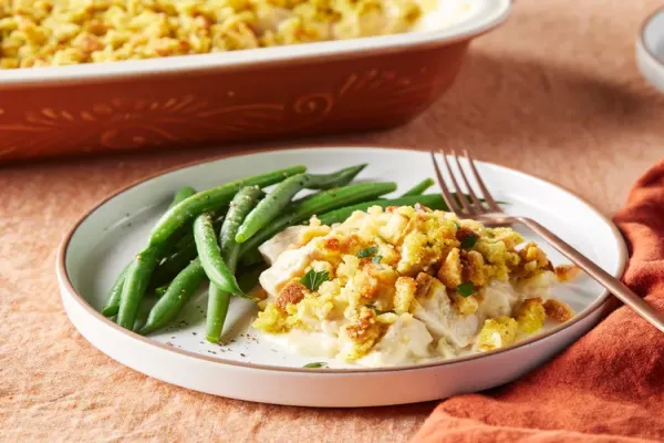 This chicken and stuffing casserole is creamy and comforting on a cool winter evening — the whole family will love it! The crispy topping on this old-fashioned casserole is easy to make with a quick-cooking stuffing mix. A store-bought rotisserie chicken is required, but if you have leftover chicken on hand, use it! Leftovers are yummy, too.