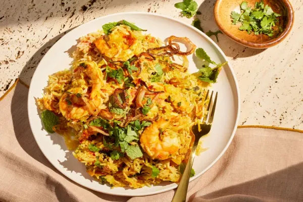 This shrimp biryani is aromatic and complex, homey and comforting. A mixture of spices, bloomed in ghee, flavor both the rice and tomato sauce, and the entire dish is baked layered with spiced yogurt-marinated shrimp.