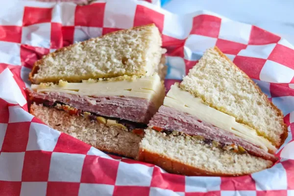 My Italian family loves this recipe! A crusty loaf of Italian bread is cut in half, and layered with olives, and various meats and cheeses.