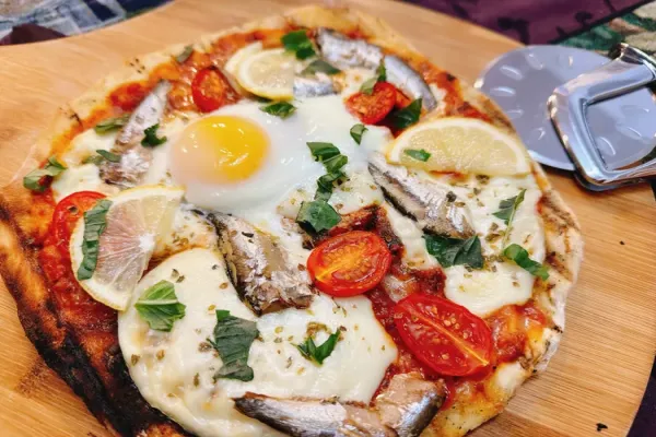 This sardine pizza showcases the vibrant flavors of the Mediterranean. With sardines, fresh mozzarella, tomatoes, and fresh and dried herbs, it’s perfectly tangy and salty.