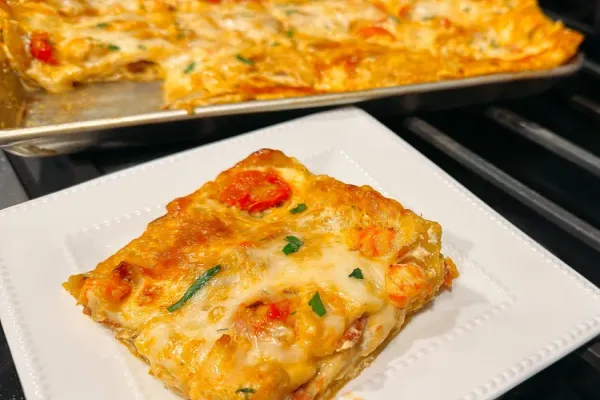 This langostino sheet pan lasagna, layering tender noodles with a langostino and cherry tomato lobster bisque sauce, ricotta filling, bacon, and mozzarella, is a nod to the viral Trader Joe's langostino pasta. Bake until golden and bubbly, and garnish with fresh basil.