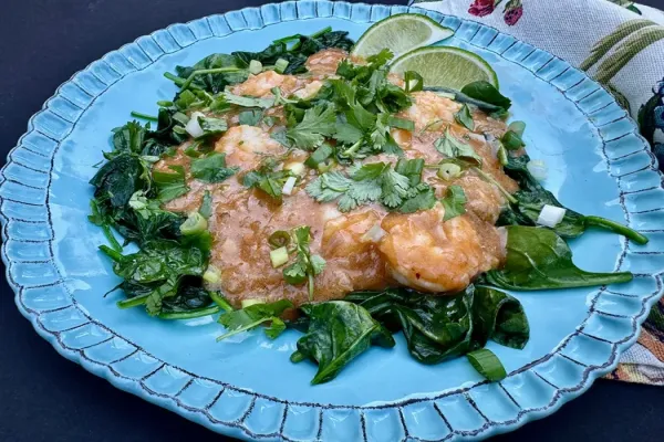 This shrimp in coconut curry sauce comes together quickly, so have all the ingredients ready before you start. The spice level of the sauce can easily be adjusted by leaving out the red pepper flakes, if you wish. We liked it over lightly cooked spinach, but of course, steamed jasmine rice would be good, too!