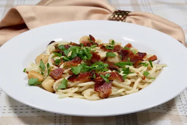 This scallop and bacon spaghetti is made with bay scallops—small, hearty, and less expensive than sea scallops. This is a perfect budget-friendly dinner for two, a tasty, quick-and-easy weeknight meal that’s on the table in under a half hour.