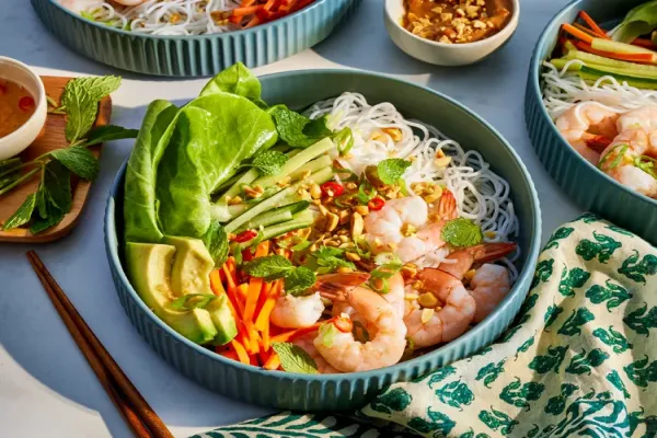Vietnamese summer rolls become a cool, refreshing meal in a bowl, and almost everything can be done ahead of time. Rice vermicelli, lettuce, herbs, carrots, shrimp, and pork are drizzled with a peanut-hoisin sauce, with a little, or a lot of heat—you decide!