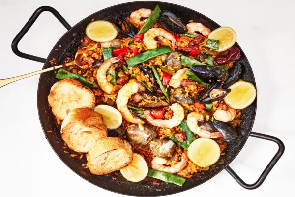 This seafood paella, short grain rice flavored with saffron and chorizo, is topped with steamed clams, mussels, and shrimp.